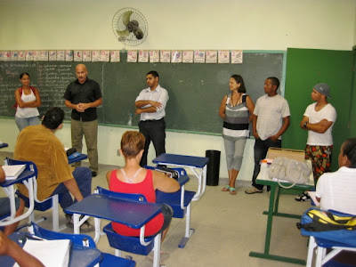 Three of the people who accepted Christ were a couple and their daughter who were visiting the church for the 2nd time. Pastor Eduardo told me that they were "Spiritists", which is a religion or philosophy that many Brazilians follow. Spiritism is a belief in various spirit beings and in reincarnation, and is a mixture of philosophy, science, and moral beliefs. Apparently they had studied spiritism quite seriously for many years. God touched their hearts in a very powerful way and all of them accepted Christ and committed their lives to Him. Afterwards we got to meet them and chat with them for awhile. This morning they sent me an email, and they are very excited about their new restored relationship with God. They also said that their daughter wants to help us as an interpreter in our project in the schools. It is always great to see God powerfully working in the lives of others.